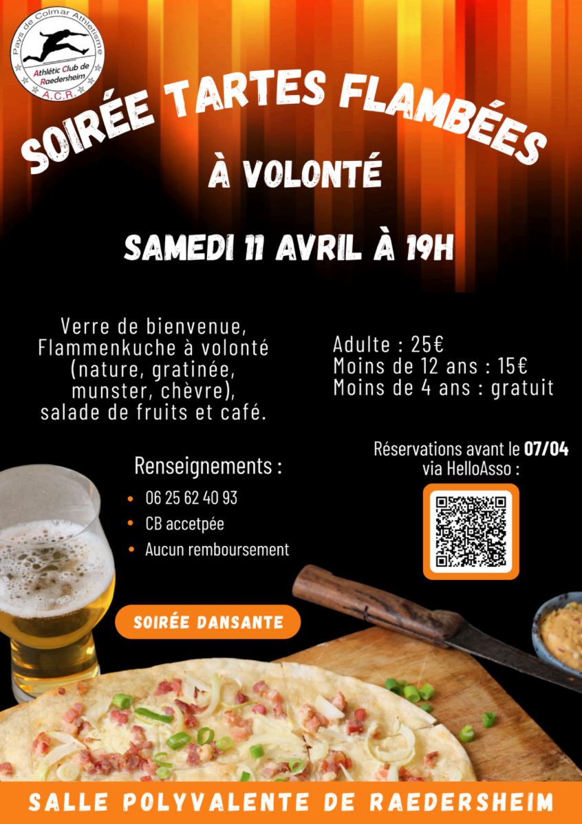 Organisateur ACR Lieu Salle polyvalente de Raedersheim Radersheim CatΓ©gorie ΓvΓ©nements Plus d'Infos Plus d'informations Date 11 Avr 2026 Heure Toute la journΓ©e SOIRΓE TARTES FLAMBΓES ACR Partagez cet Γ©vΓ©nement + Ajouter Γ mon Agenda Google + Exporter vers iCal